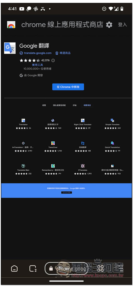 下圖是 Chrome 線上應用程式商店頁面,找你要安裝的擴充功能,我以 Google 翻譯為例: