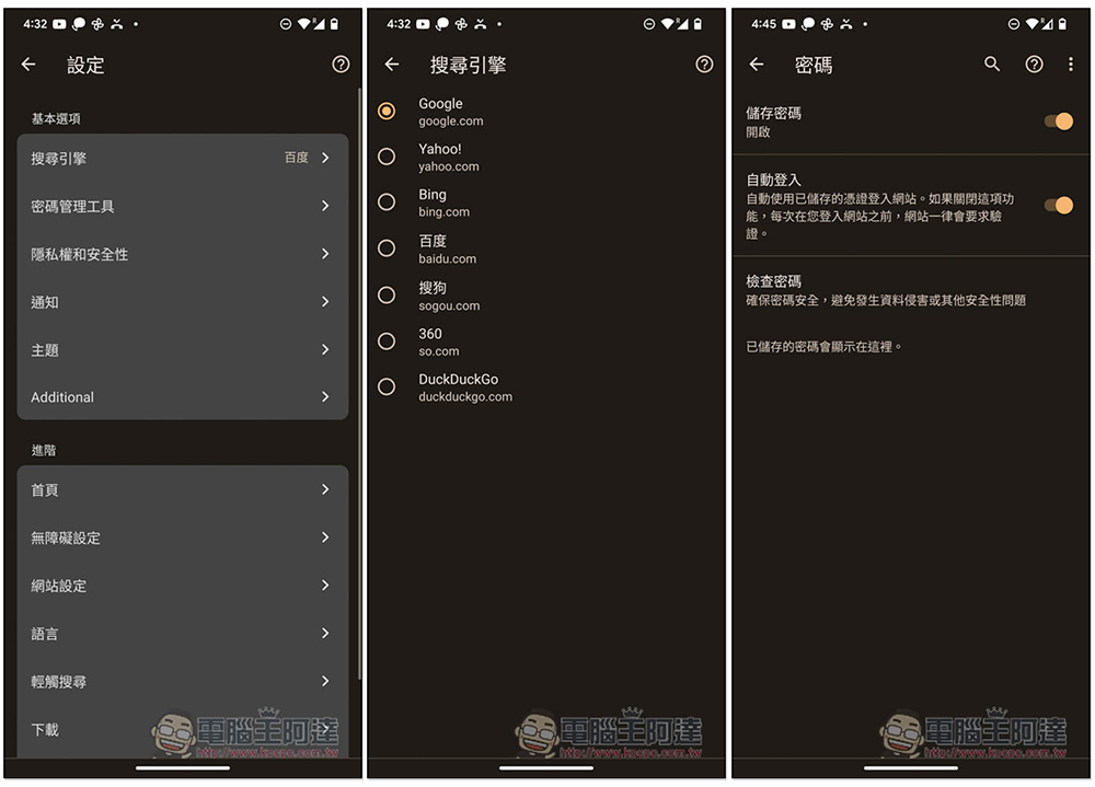 預設搜尋引擎是百度,可以改成其他,像是 Google、Yahoo!、Bing。密碼預設也會儲存,介意的人建議關掉(在密碼管理工具裡面),自動登入也可以考慮關掉: