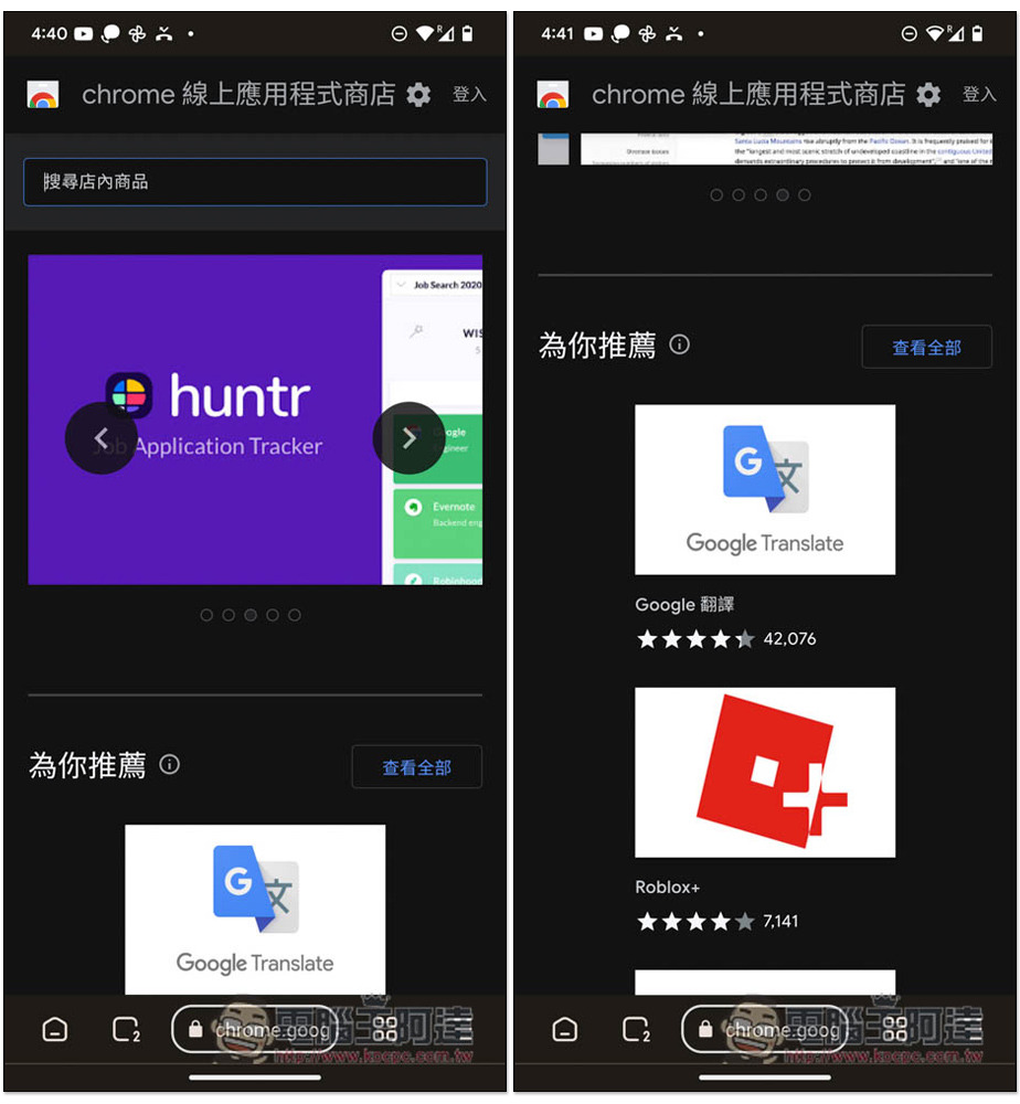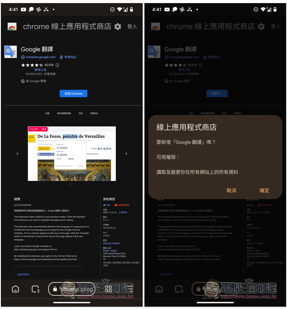 進入擴充功能頁面就會看到 "加到 Chrome" 功能,跟桌面版瀏覽器一樣,按確定之後就會新增:
