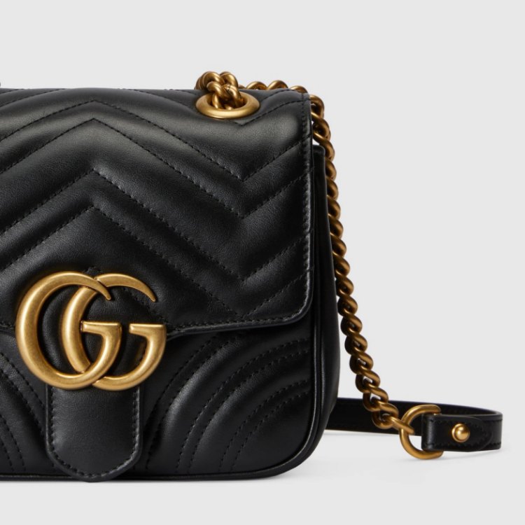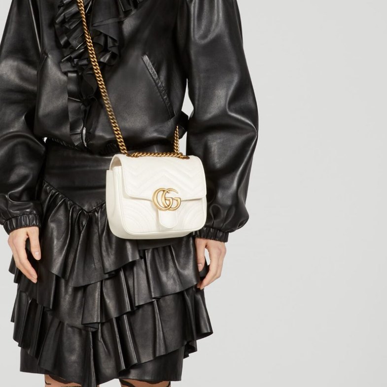 這款小方包在背帶的設計上亦別具巧思,在鏈帶的配色上呼應 GG logo 的黃銅色澤,以較為仿舊的形式呈現,在細節上設計師巧妙的加入皮革肩背帶用其中,讓在使用時能減緩肩膀上的負擔,可調整長度的設計,更讓其包款可休閒的斜跨,同時亦可優雅的單肩背。