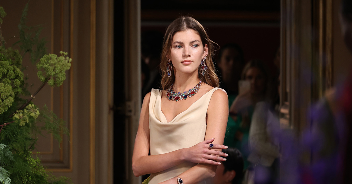 就如同花園中一場歡快盡興的饗宴,體現寶格麗對色彩運用駕輕就熟的深厚功力。鑲嵌了枕形切割紫水晶、橄欖石、紅碧璽、海水藍寶石與黃色綠柱石,對比色彩卻無比和諧亮眼。錯落鑲嵌清透粉色與紫羅蘭色的圓形明亮切割尖晶石,搭配紅碧璽圓珠與密鑲鑽石,彷彿盛宴中的甜美果實,充滿活力。