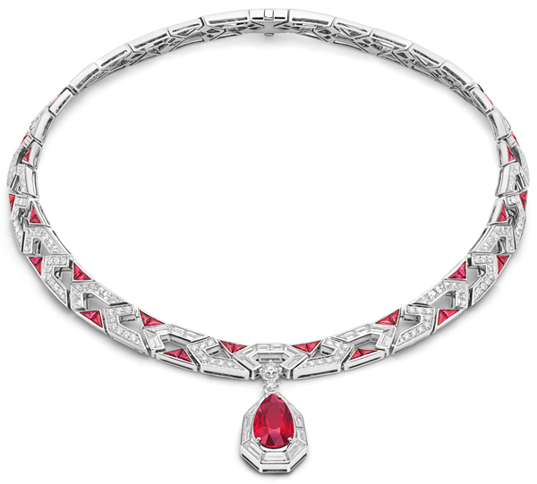 向火焰的力量致敬,傳達大自然的能量,正因唯有高溫才能夠淬鍊出珍貴華麗的寶石,「Fire of Eden(伊甸之火)」頂級鑽石與紅寶石項鍊,是新系列中唯一的紅寶石項鍊作品。為彰顯紅寶石的珍貴,項鍊以簡潔俐落的幾何設計,彰顯出鍊墜鑲嵌的7.02克拉莫三比克鴿血紅紅寶石,以獨特的梨形明亮式切割完美體現鮮豔濃郁的紅艷色澤。