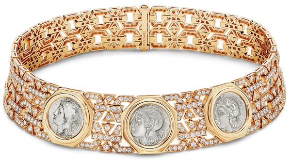 「Monete(古幣)」,也是寶格麗另一大獨一無二的設計特色。如果說寶石是大自然的淬鍊結晶,那古幣正是歷史洪流留下的文明遺產。鏤空設計的玫瑰金頸鍊鑲嵌密鑲鑽石鑲式,以幾何的俐落線條彰顯鑲嵌其上的3枚西元前400-350年、羅馬帝國時期義大利南部盧卡尼亞及韋利的雅典娜古銀幣,讓人感受人類智慧文明的奇蹟,流露不凡氣勢。