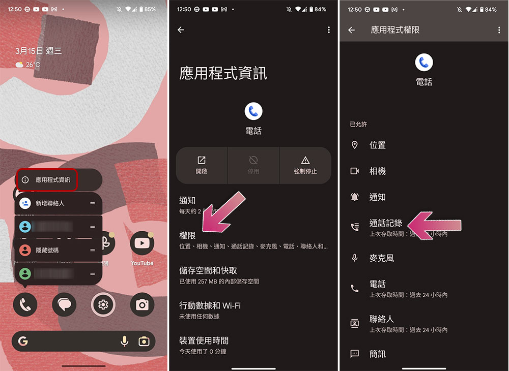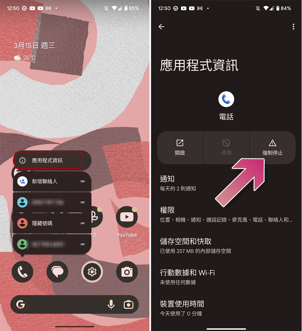 - 在電話應用程式上長按,並點擊進入「應用程式資訊」。