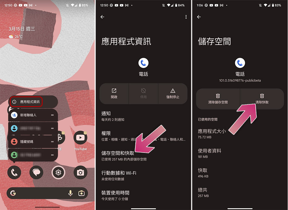 (如果是舊版系統可以從設定 >> 應用程式 找到電話應用後進入查看) - 在應用程式資訊內頁點擊「儲存空間和快取」。
