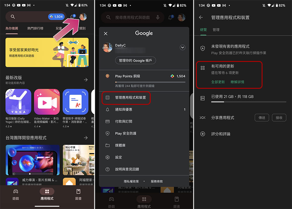 - 在 Google Play 商店點擊右上角的個人頭像。
