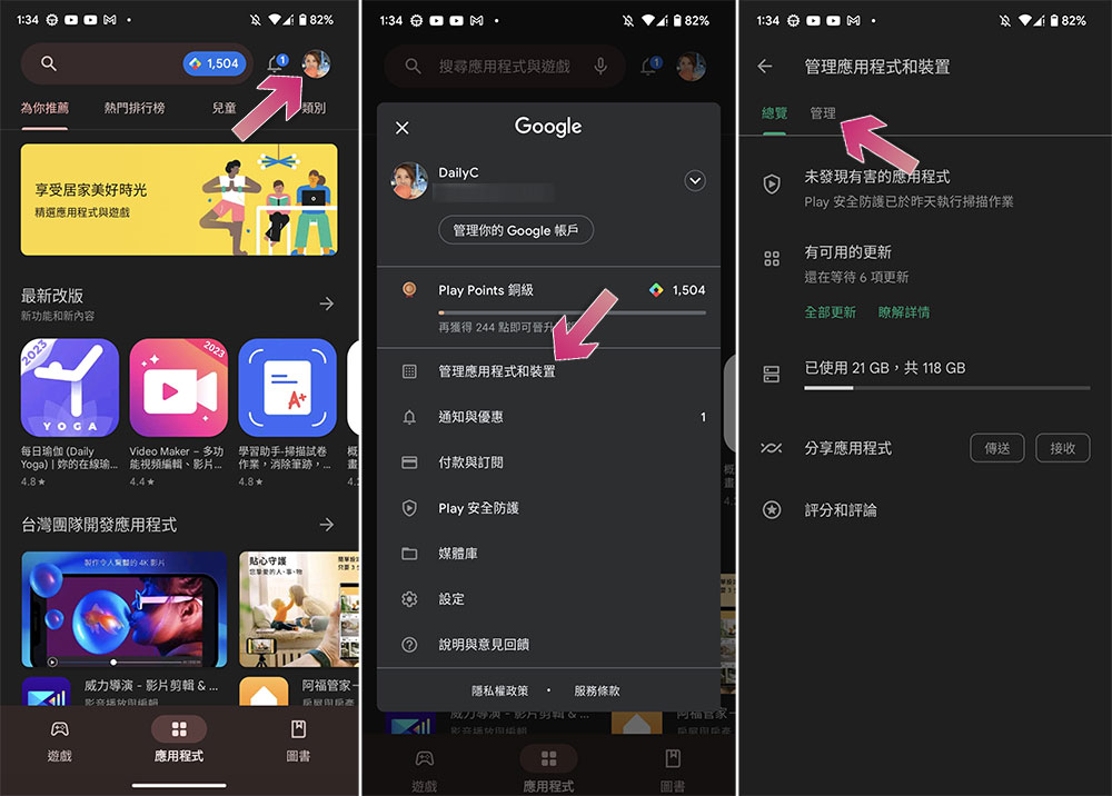 - 打開 Play 商店,點擊右上角個人頭像開啟功能表。