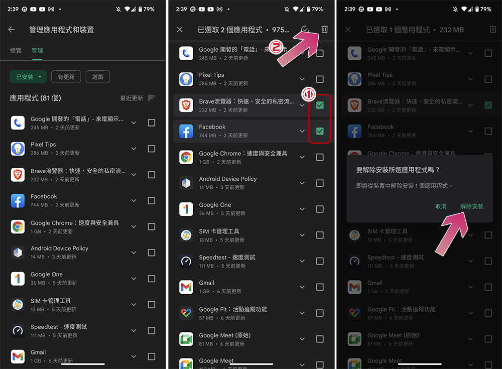 - 勾取應用程式右側的複選框,然後點擊右上角垃圾桶圖示將其卸載。