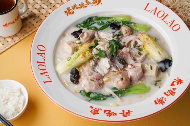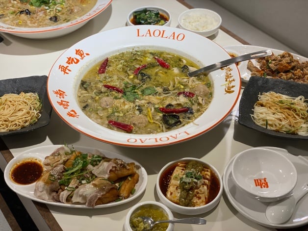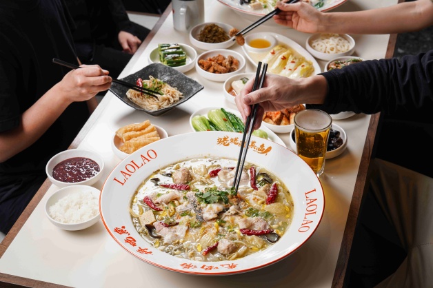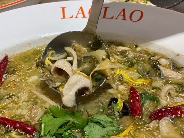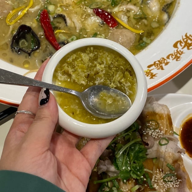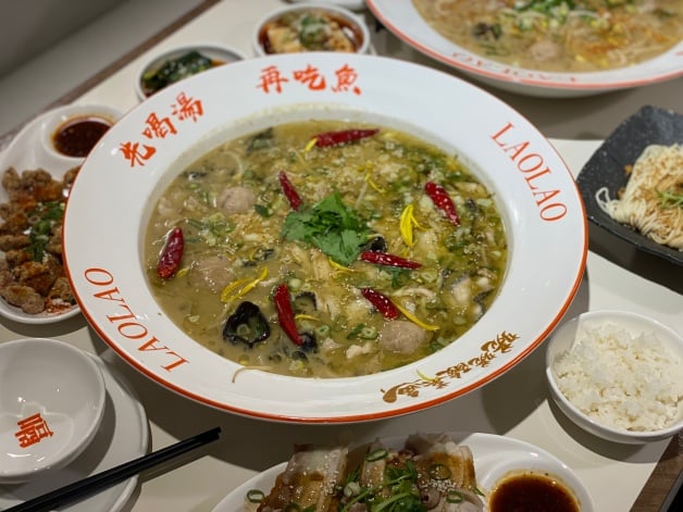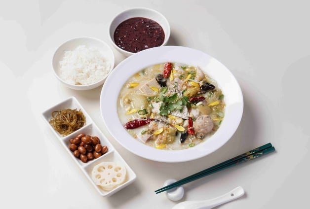 招牌「姥姥酸菜魚」以魚皮、魚骨、雞骨等長時間燉煮湯頭,再加入姥姥酸菜,魚片嚴選營養價值高且肉質細嫩的烏鱧魚,起鍋前淋上爆香過的「花椒油」增添香氣,最後撒上辣椒乾、蔥花和香菜點綴,吃起來香麻但不死辣!