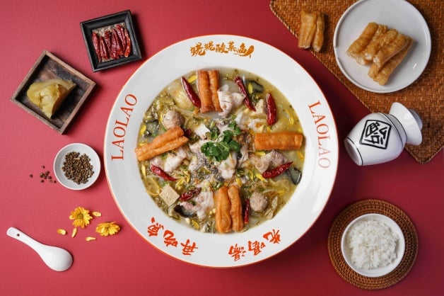 每鍋酸菜魚都會經過五道工序,從加入海陸空頂級食材慢火燉出膠原精華的「熬湯」、嚴選烏鱧魚去除骨刺加入獨家配方醃製「片魚」、鍋底加入花椒油、酸菜和香料大火炒香的「炒料」、鍋內加入高湯滾煮放入魚片60秒起鍋「鍋煮」、起鍋燒油放入辛香料並爆香的「嗆油」、酸爽麻香登場的「出鍋」,因為有鍋油的關係,保溫效果超好!