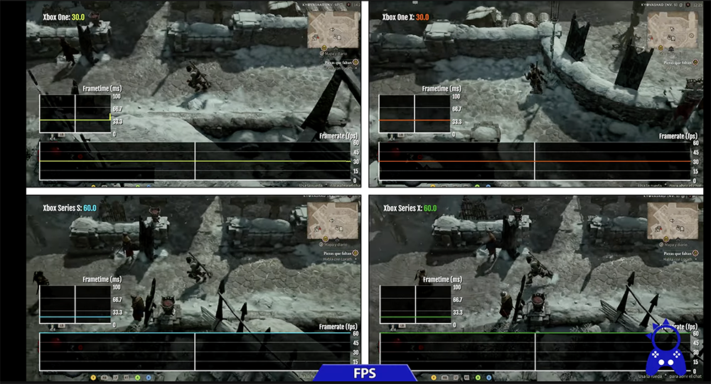 影片中 ElAnalistaDebitits 會個別展示《暗黑破壞神4》同一場景,但在不同平台的短片,從中就能清楚看到在 Xbox 平台中,哪一個主機的畫質表現最好,哪一個最差。此外,2 分鐘左右有遊戲 FPS 實測,Xbox One 和 Xbox One X 只能提供 30FPS(有時候 Xbox One 還會掉到 29FPS,不像其他平台這麼穩定),Xbox Series S/X 則可以來到 60FPS: