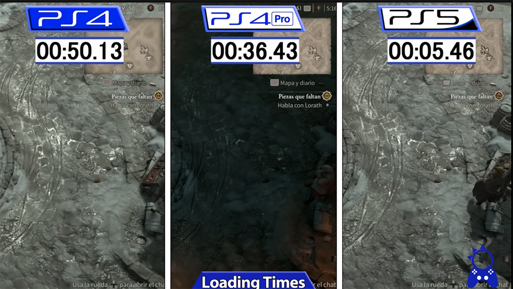 最後是 PS4 vs PS4 Pro、PS5,這部分差距就蠻明顯的,像是讀取速度,PS5 只需要 5 秒,PS4 Pro 要 36 秒,PS4 更來到 50 秒: