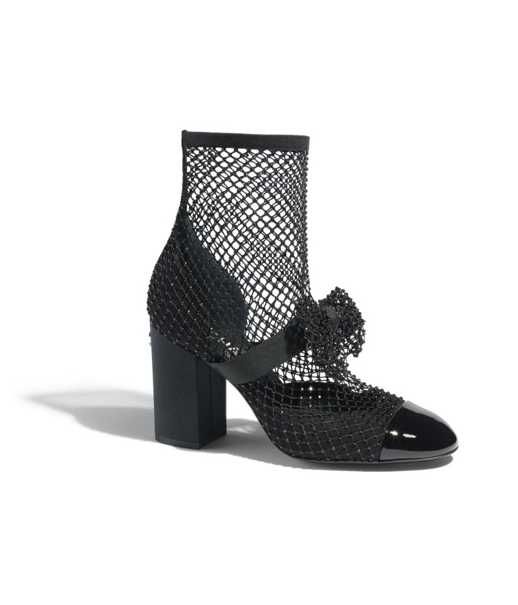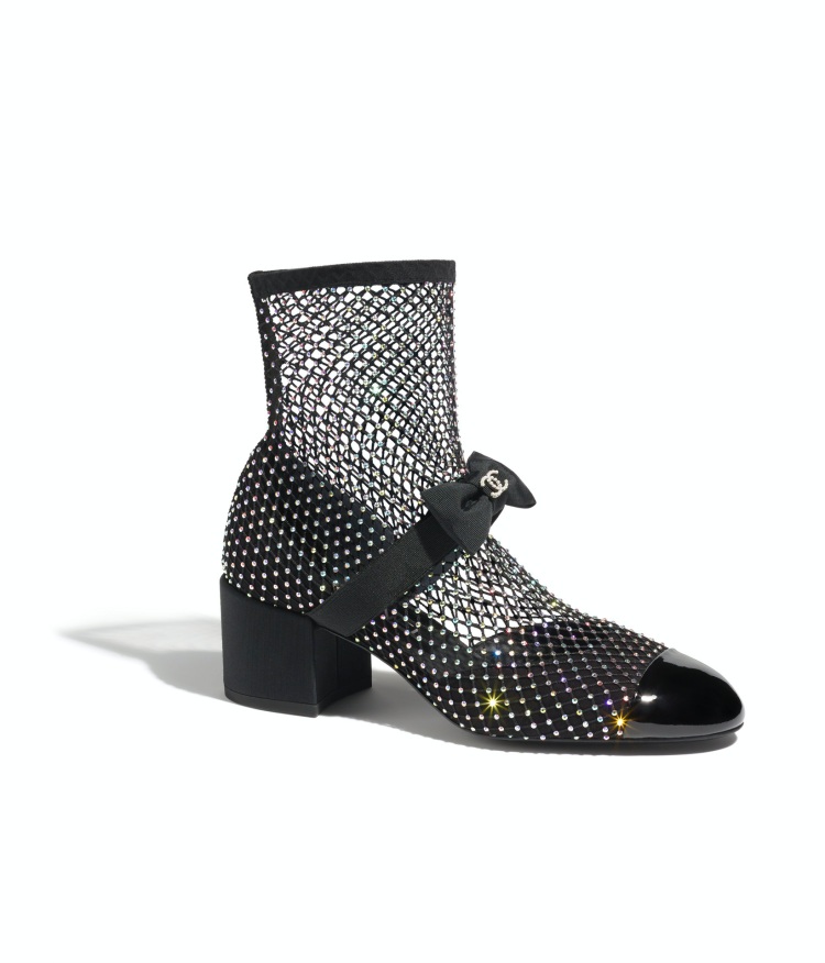這雙同樣以全黑網狀為基底的低筒靴,搭配上中跟的設計,即同色系的水晶點綴,讓女孩在穿著時能兼顧舒適之餘,還能拉長腿部線條,黑色水晶則低調為妳的雙腳打亮。(商品售價:NTD82,500)