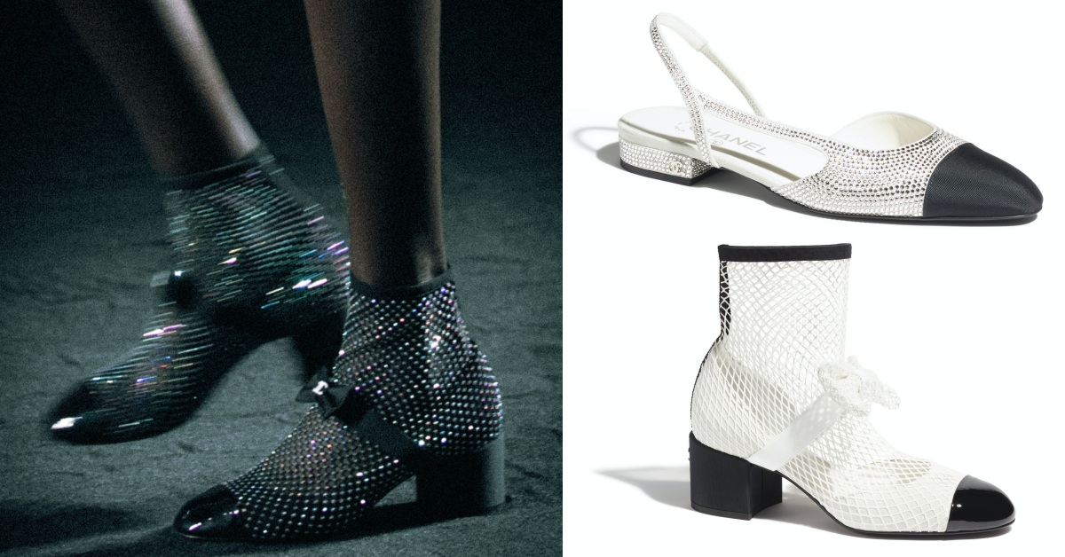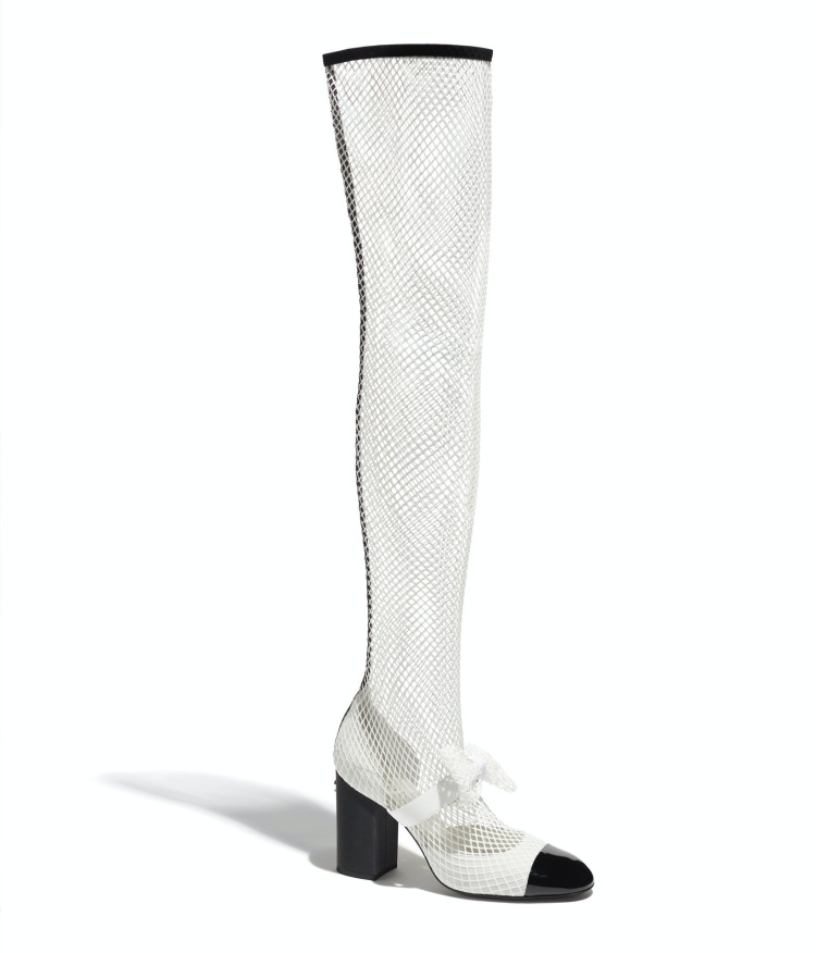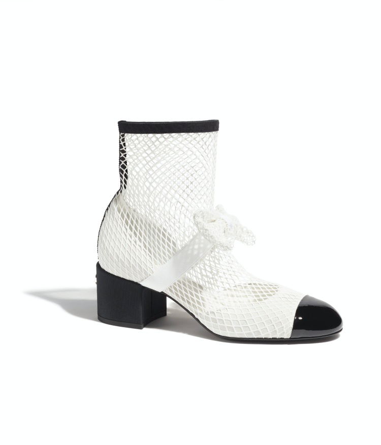 延續網狀的靴身,再加上雙色鞋的廓形,這雙少了水晶點綴的靴款,以純白的樣貌登場,從蝴蝶結至鞋身皆以網襪形式呈現,其輕盈的視覺感,更適合在春夏時的日常做搭配。(商品售價:NTD54,900)