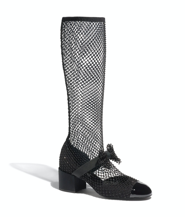 延續長靴的靴型,這雙以黑色網狀呈現的靴款,自帶的性感氣息,加上低調的水晶呈現其中,女孩穿上它絕對能成為一場聚會中,不容忽視的主角。(商品售價:NTD106,500)