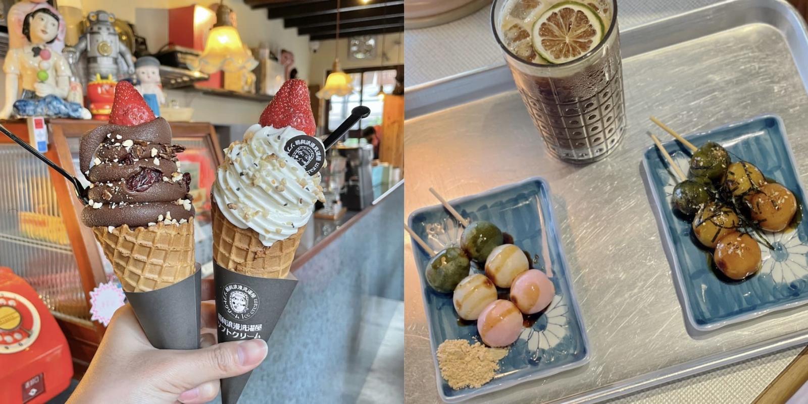 有別於昭和浪漫冰室的各式口味雪花冰,昭和浪漫洗濯屋則是販售霜淇淋,且根據不同季節不定期更換霜淇淋口味,儂編點了大人的威士忌巧克力以及北海道牛奶海鹽兩種口味,前者濃郁帶點為苦的巧克力加上酒漬葡萄乾與金巴芮脆片,帶給你視覺與味覺雙重享受,後者則是以海鹽點綴濃郁的牛奶霜淇淋,整體吃起來清爽不膩口!其他像大人味布丁、Q彈的日式烤糰子,以及各式古早味飲品也都很值得試試!