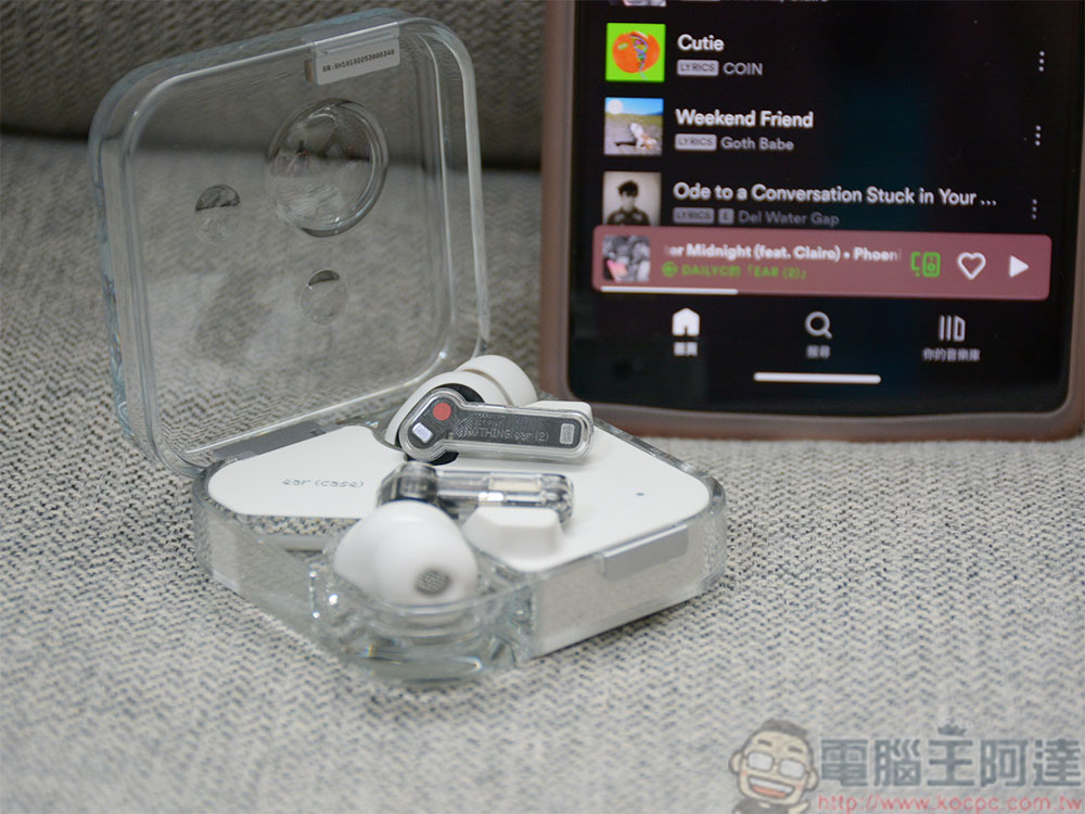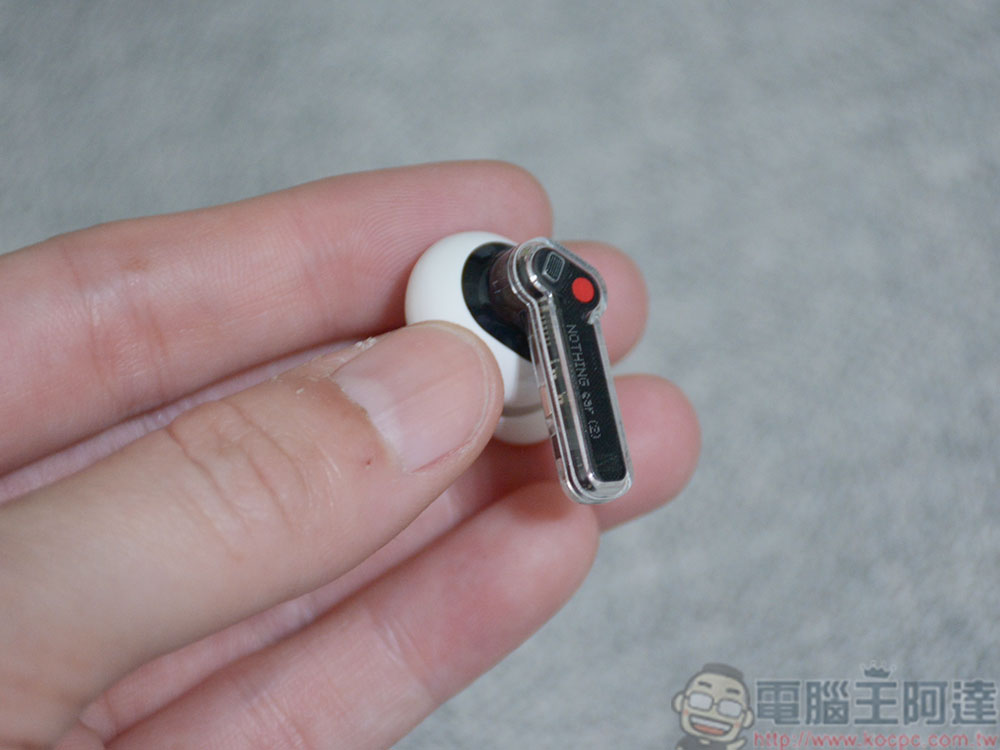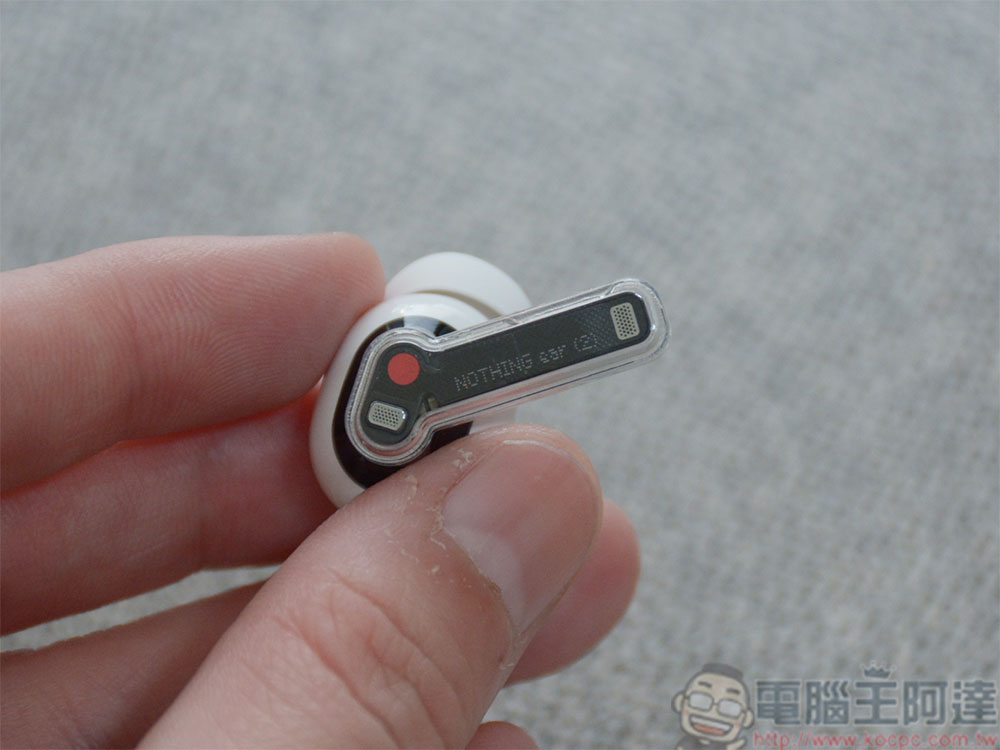 老實說,筆者不喜歡「觸控」操作的耳機,每當我撥個頭髮都會不小心誤觸,這點不方便。Ear (2) 的按壓感應器位於耳機柄前側,包含長按切換主動降噪或通透模式(很有趣的是,當你切換到通透模式會有個類似女生嘆息聲來提示)、短按暫停 / 播放等,不管是回饋或是指示都非常明確,不用為了確認到底切換沒按個不停。