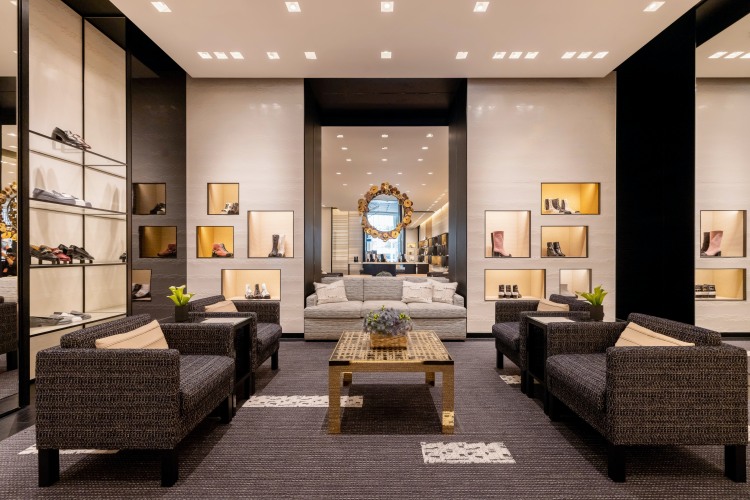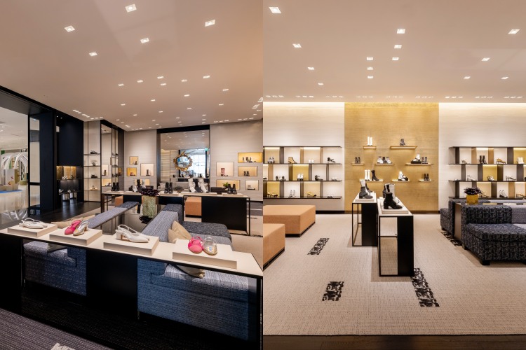 Chanel 高雄漢神巨蛋鞋履專門店全面積超過 110 坪,其碩大寬敞的空間是由紐約設計師 Peter Marino 操刀,總穿著一身皮衣勁裝的他,其細膩的設計風格完整體現於此次的店舖中,全店以標誌性的白色、米色與黑色系打造,細部的設計再以金色作為點綴,在軟裝選擇更巧妙的以斜紋軟呢沙發為主軸,布面度獨特的織紋更與地毯、桌面相呼應,用滿滿的細節展現 Chanel 的品牌符碼。