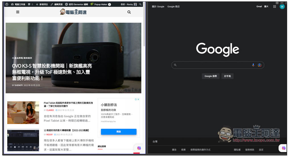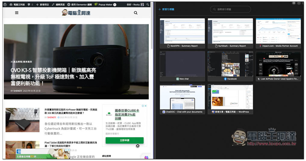 就會看到原本的畫面變成兩個小視窗,左邊會保留你當下開啟的網頁,右邊則可以從當前已經打開的標籤中選擇,又或是自行輸入網址也行: