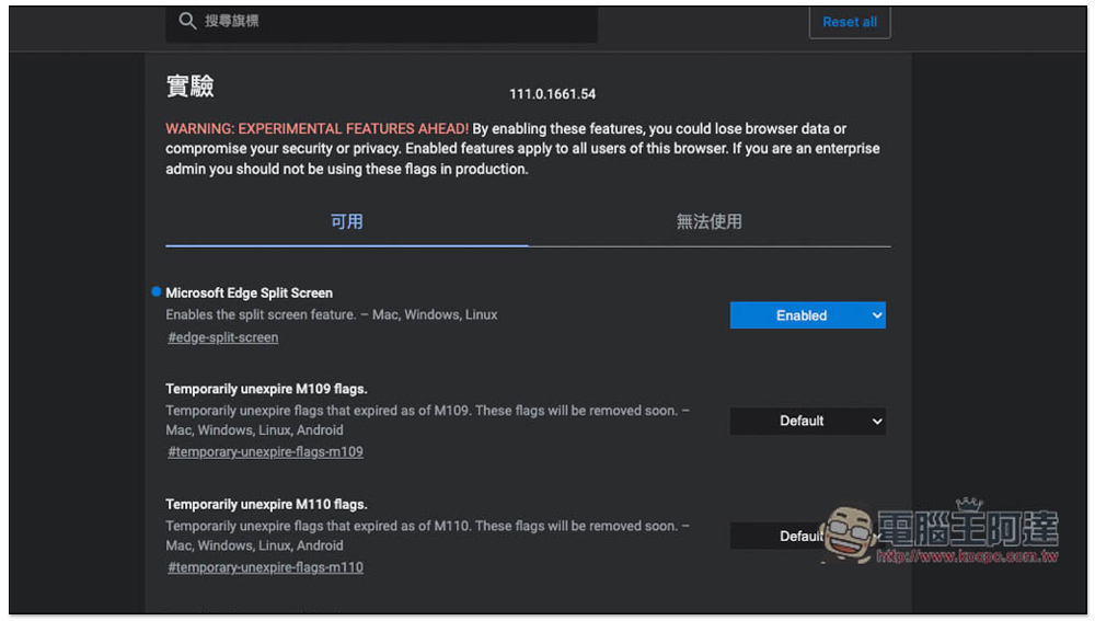重啟完成後,就會看到 Microsoft Edge Split Screen 這功能變成 Enabled:
