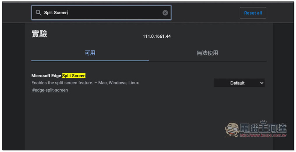 就會進到實驗性功能頁面,於上方搜尋欄中輸入「Split Screen」的關鍵字,即可找到 "Microsoft Edge Split Screen" 的功能,右側預設是 Default,也就是未開啟狀態:
