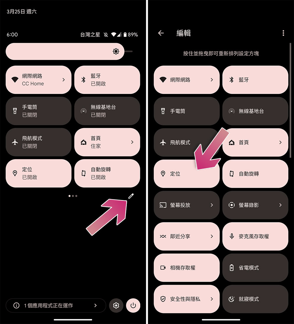 - 首先你必須將「定位」設置在「快速設定」面板中。點擊編輯圖示(鉛筆),將定位設定到面板上,你還可以拖曳上下排序。