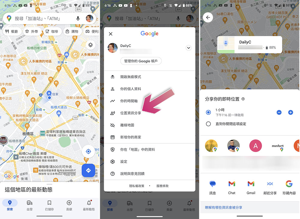 Google 地圖就是一個非常明顯可以共用 Android 手機位置以供其他人查看的應用程式。雖然允許你與他人共用的功能很棒,但請務必進入並檢查誰可以實際看到它。朋友和家人通常會被允許,但如果你會與同事或其他人分享了個人位置,請務必是將其設為臨時共享。只需在設定分享位置時,進入 Google 地圖並點擊個人頭像,點擊「位置資訊分享」,並且為分享設定時間限制,不要設為直到關閉為止,以免自己忘記關閉始終讓人知道你在哪裡。