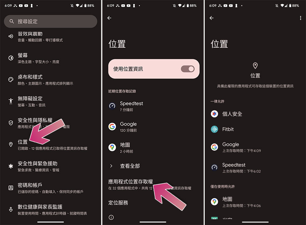 在 Android 設備的設定應用中,你可以在「位置」項目中查看有哪些應用程式擁有訪問你的位置的許可權,並且能夠精準地控制哪些應用可以造訪,這是一種更精細的整理方式,而非一股腦全部關閉定位功能。