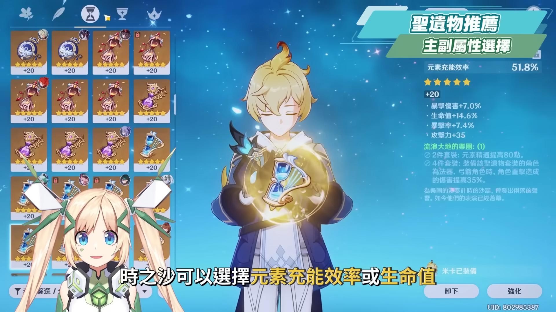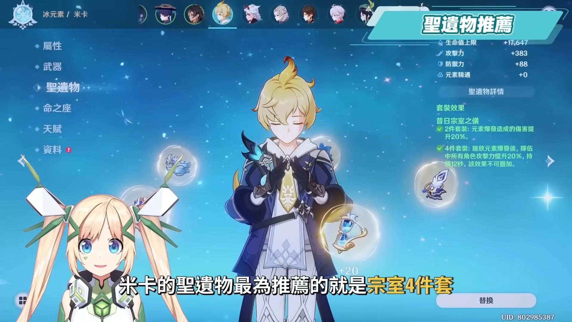 米卡的聖遺物最為推薦的就是宗室4件套,主要的關鍵是在於4件套的效果可以提供額外的攻擊力%數效果,用以輔助吃攻擊力數值的輸出位角色,要注意的是宗室4件套,隊伍中只需要有一個人穿就好,假如和班尼特放在一隊的話,可能其中一個人要改成其他套裝,避免多出的套裝效果吃不到。而其他替代方案則可以考慮提供元素充能的絕緣2件套、提升治療效果的少女2件套、海染2件套等等。萌新也可以考慮搭配流放者與學士2+2套裝。