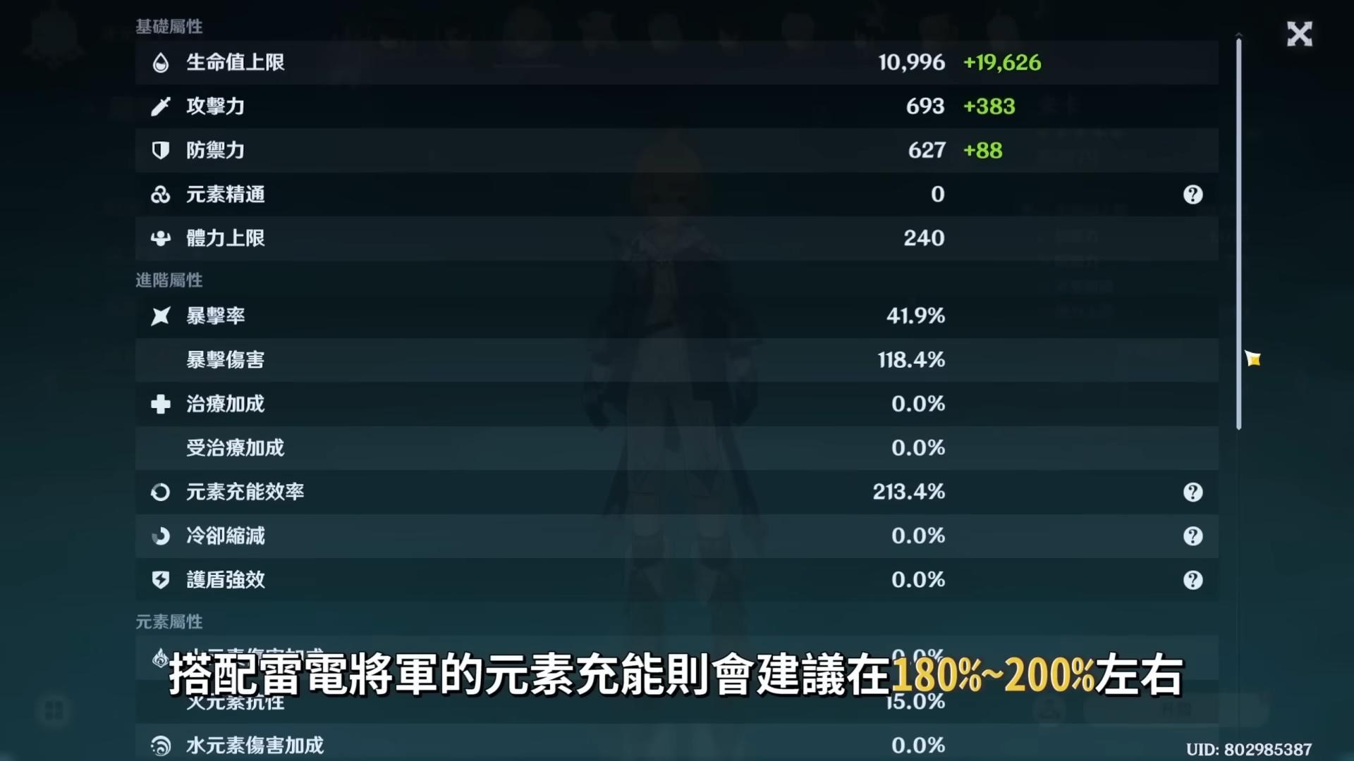 畢業面板參考,血量可以在30000以上,元素充能效率若是沒有搭配雷電將軍的元素充能則會建議在180%~200%左右,隊伍中有雷電將軍則大致上可以改成生命沙,元素充能有120%~130%左右就夠用了,若是搭配西風長槍則暴擊率需要疊到至少50%以上。