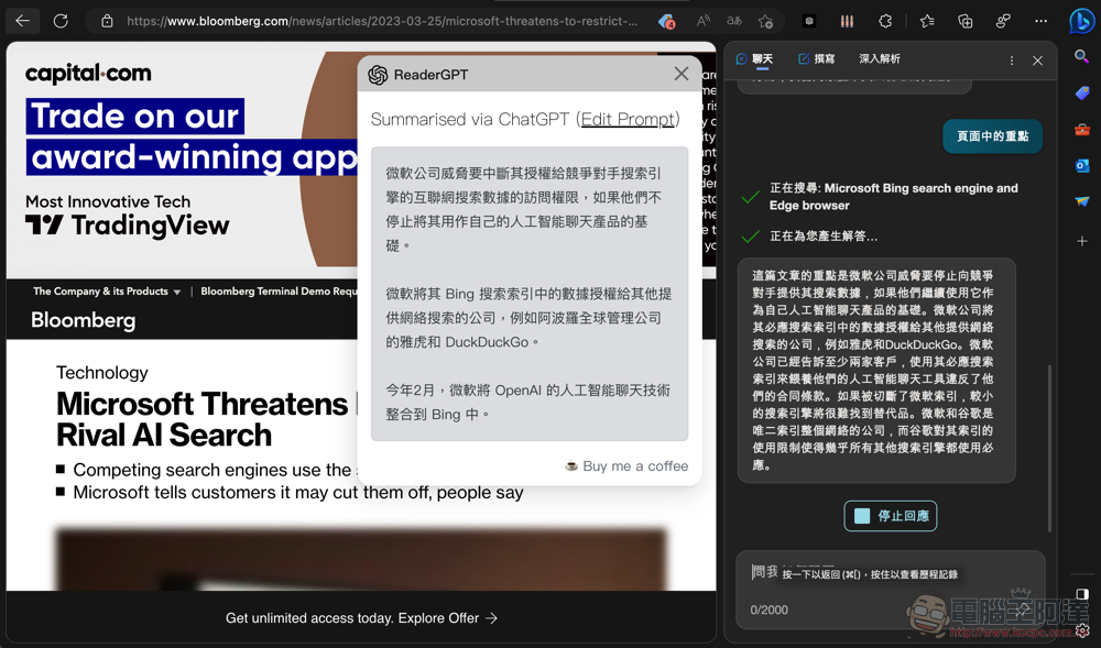 是說,在透過已經啟動 Bing Chat 的 Edge 桌面版本試用這個功能的時候,筆者意外發現 Bing Chat 側邊欄功能好像偶爾也會觸發偵測到目前網頁上文章的內容進行摘要。看來微軟對於這樣熱門的應用方向也相當積極呢。不知道內建在 Edge 的話,大家是不是就不會安裝 ReaderGPT 了?