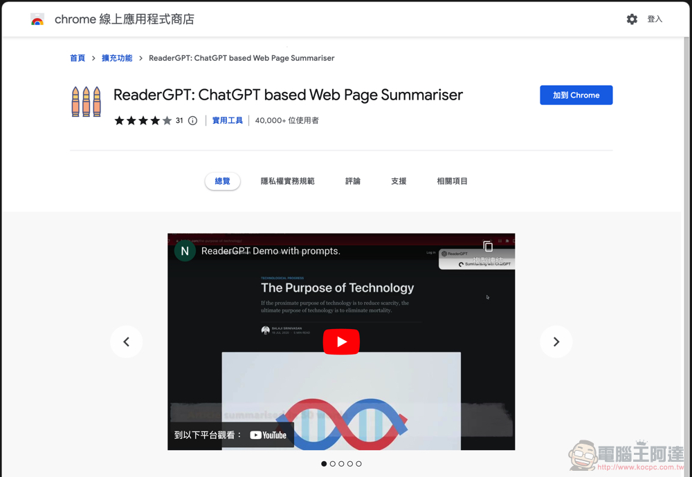 ReaderGPT 是一個可以直接在 Google Chrome 與 Microsoft Edge 安裝使用的 Plugin / Extension 擴充功能,可以直接在 Chrome 線上應用程式商店抓到(傳送門點我)。安裝之後,ReaderGPT 針對此延伸模組只有要求「讀取及變更所有網站上您的所有資料」這個權限。如果不介意的話,新增之後便可以在擴充功能中找到 ReaderGPT 這項功能。