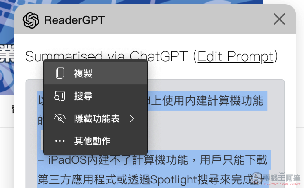 透過 Prompt 預設為英文回答的狀況,你可以自行客製修改成自己要的狀態 - 個人只是簡單加上以繁體中文回覆,修改完的版本如下「Summarise the following article in bullet points in traditional chinese:」- 雖然偶爾還是會回應簡體中文,不過基本上都都算好用。