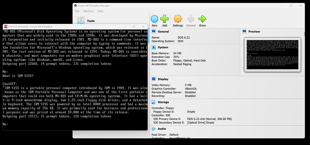 然後他叫 ChatGPT 給多一點關於 IBM 5155 攜帶式電腦的資訊,ChatGPT 也給出正確答案。不過這邊的 ChatGPT 回答會等到全部生成完才一次顯示,因此如果答案太長的話,就會停頓幾十秒的時間,這對很多現代電腦用戶來說,可能會覺得是不是當掉,但在 DOS 那年代很正常,甚至等好幾分鐘都有可能: