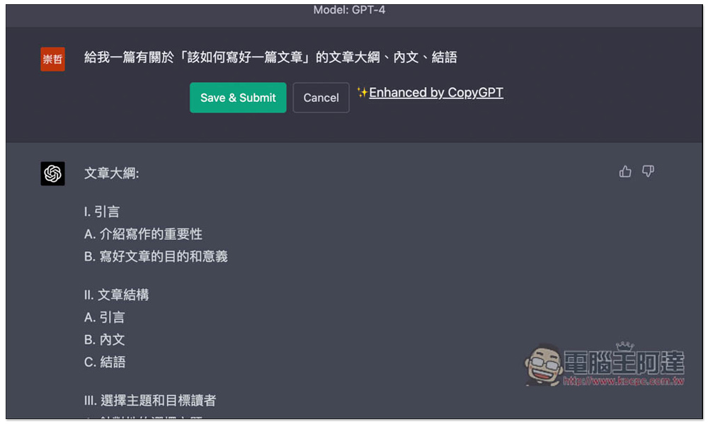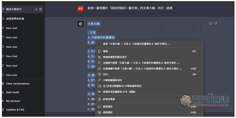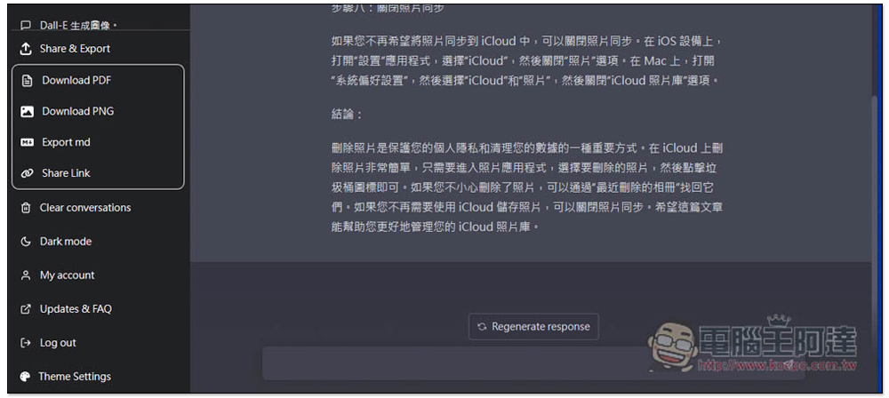 如果你是想把聊天記錄儲存下來收藏的話,那不用這麼麻煩,可以使用我們之前介紹過的 ChatGPT Prompt Genius 擴充功能,這款可以把聊天記錄匯出成 PDF、PNG 圖、或建立分享連結: