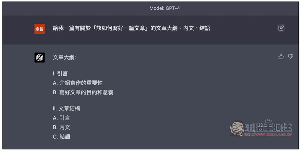 下圖是正常的 ChatGPT 畫面,沒有一鍵複製回答的按鈕,如果你想要把回答內容複製起來用在其他地方的話,只能手動反白,然後按複製快捷鍵或按右鍵選單的複製:
