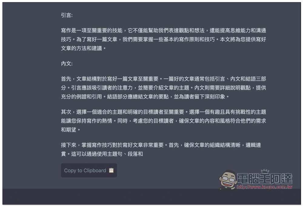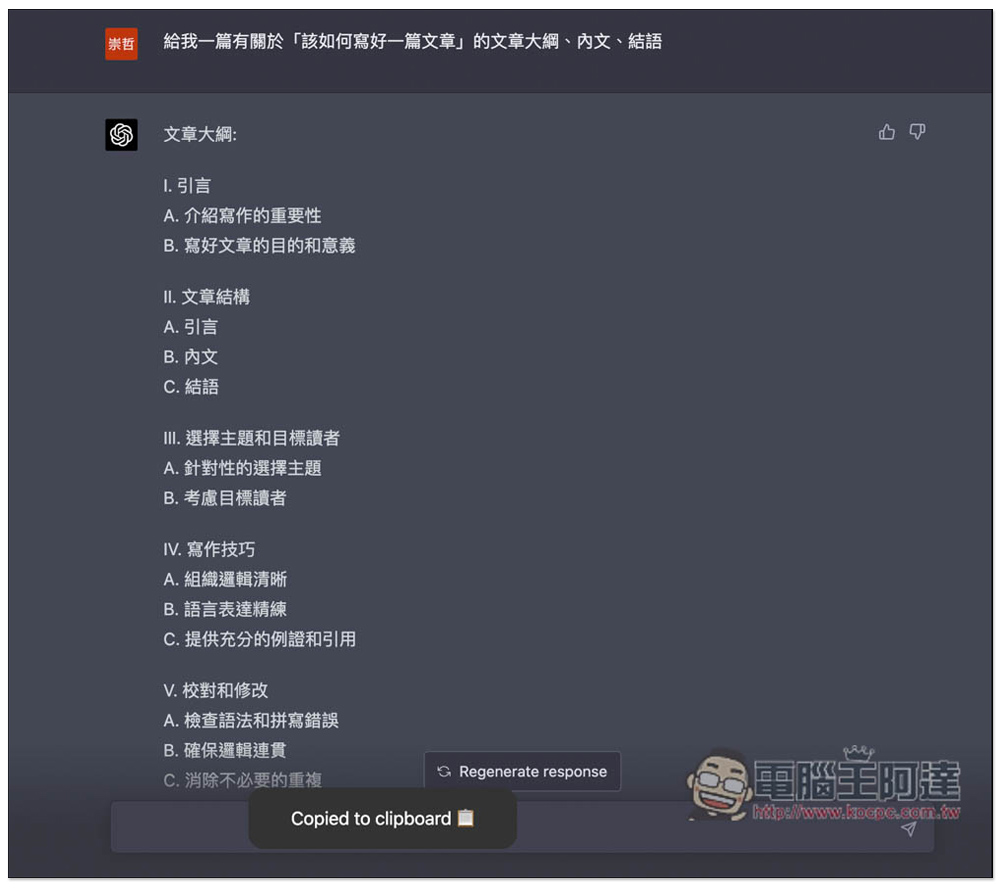 Copy for Chat GPT 的複製快捷鍵是 CMD+K,我推薦直接使用快捷鍵後,很方便。當 ChatGPT 回覆完之後,如果你想把回答複製起來,那就按一下快捷鍵,就會自動複製 "最後回答" 的內容至剪貼簿,最下方也會跳出 "Copied to clipoard" 的訊息: