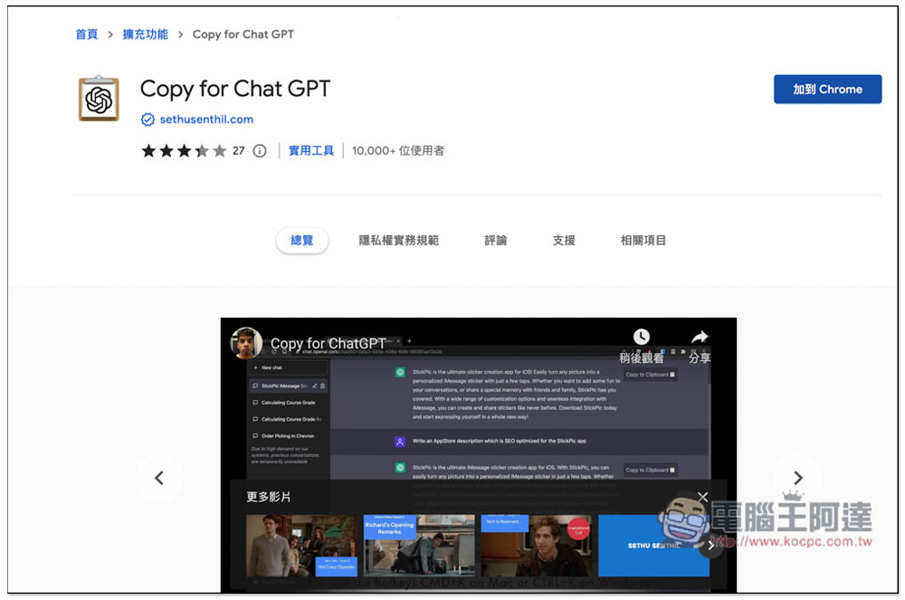 進到擴充功能商店頁面後,按右邊的 “加到 Chrome" 按鈕: