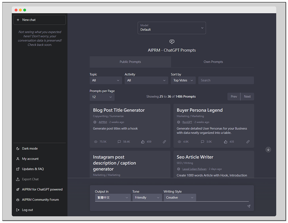 另外還有一款 AIPRM for ChatGPT 也有這功能,不過這款還提供超過 1,000 個 prompt 範本,功能非常豐富,想要更活用 ChatGPT 的人很推薦試試:
