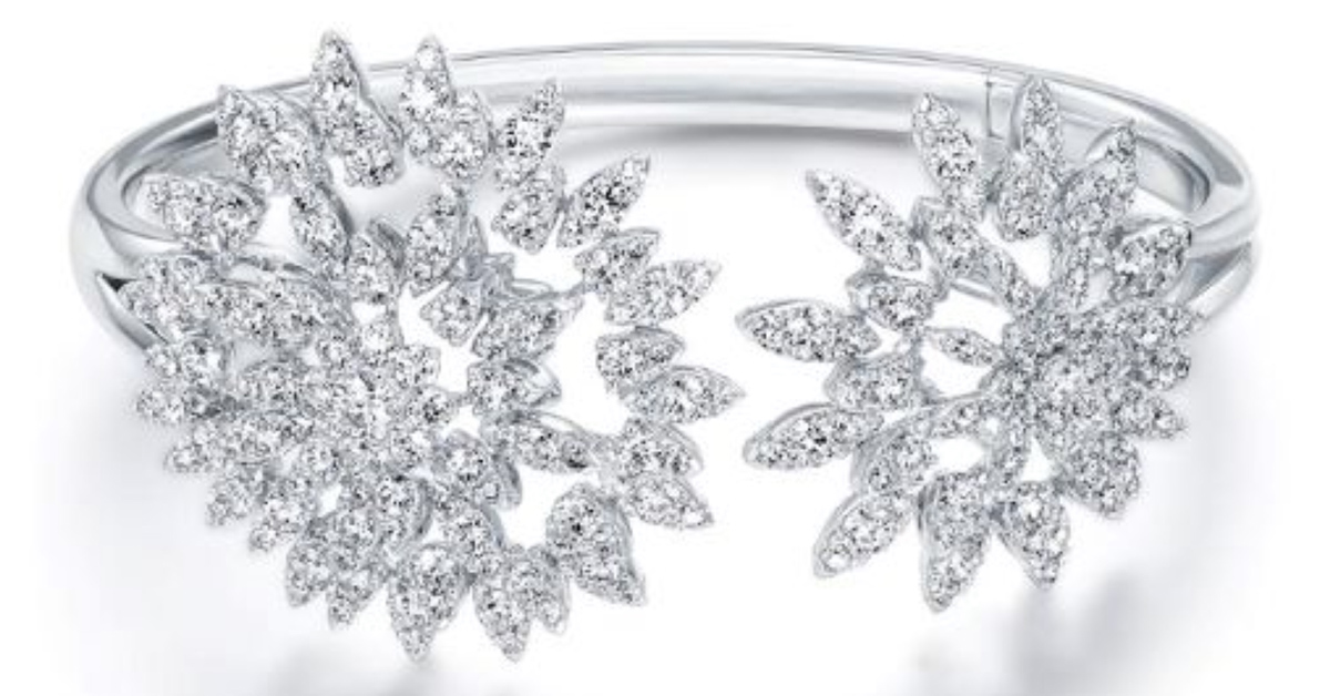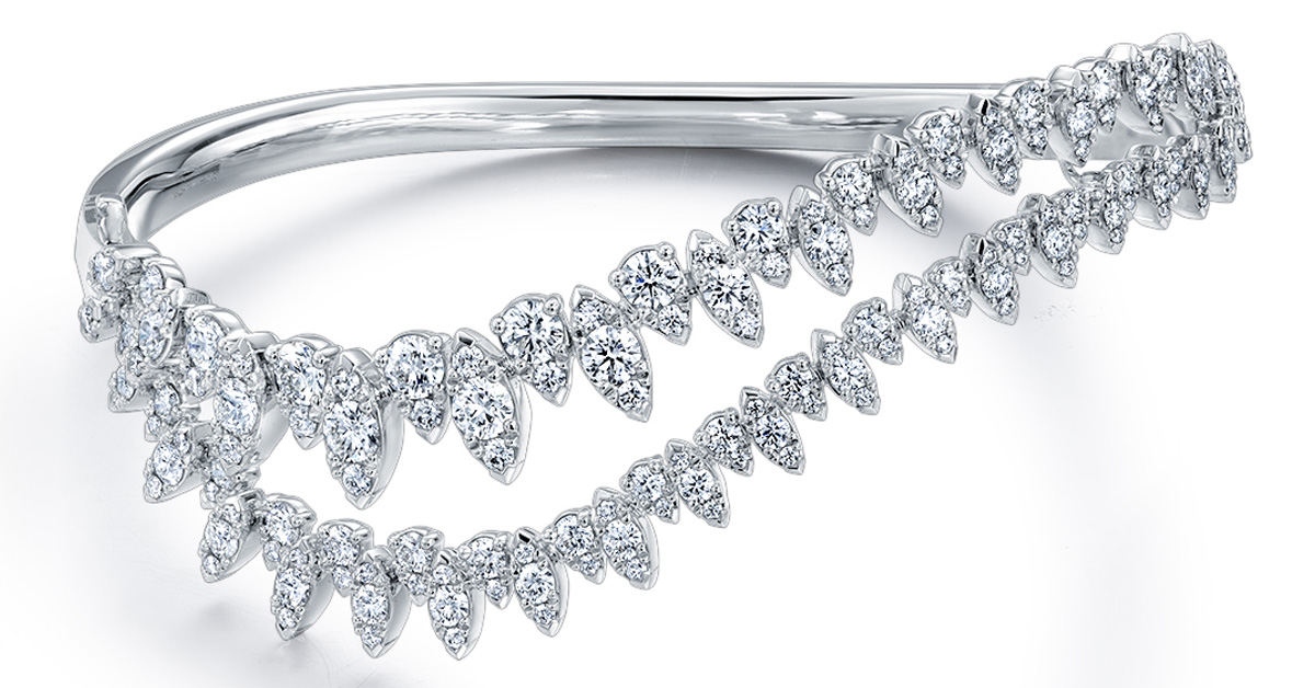 「Aerial Double Sunburst」鑽石手環,無論從哪個角度皆能折射出迷人的火光。精美鑽石勾勒而成的欖尖形與梨形圖案,營造出完美的的交錯視覺效果,可為整身裝扮添上濃墨重彩的點睛之筆。