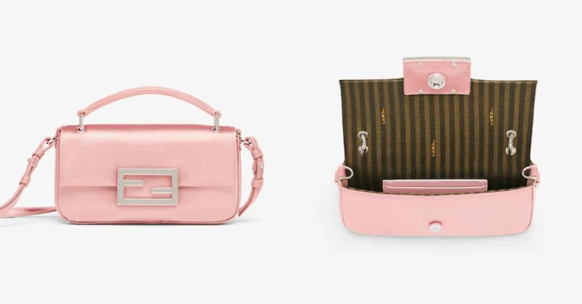 FENDI的經典不敗Baguette包,也是採用小巧的橫向設計,長方形的包款恰恰可以放入隨身的手機,包包材質是粉色的桑蠶絲緞打造,摸起來的手感絲滑無比,包蓋是以FF Logo磁鐵鈕扣開合,搭配上包身的小手柄和可拆卸肩帶,是夢幻又實用的迷你包選擇!