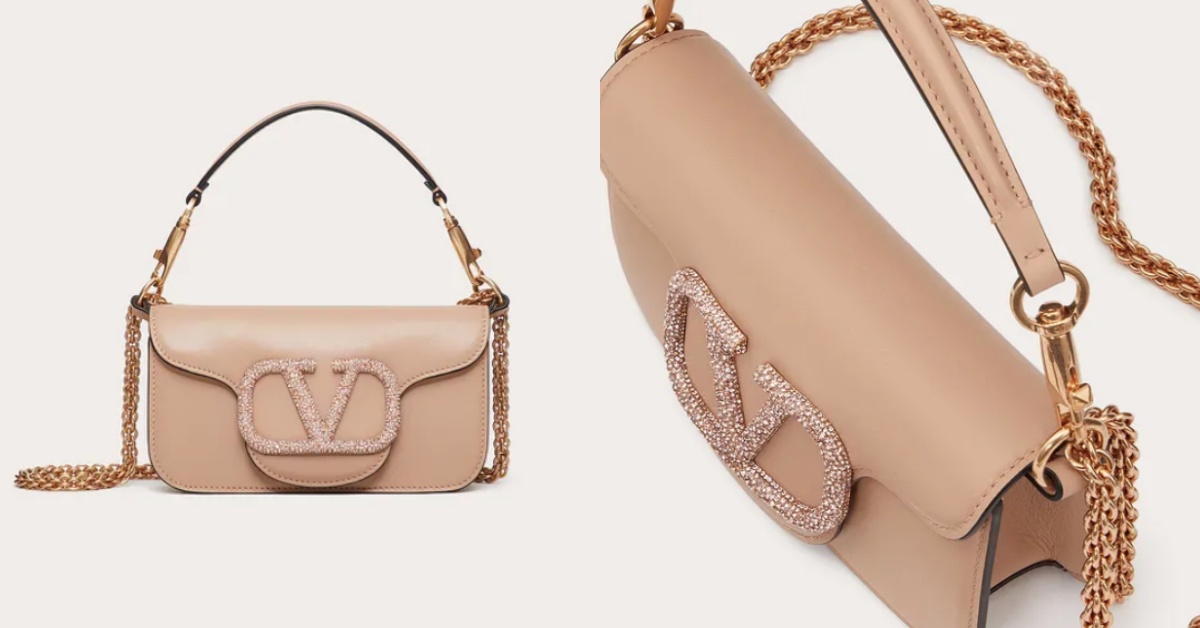 Valentino的經典Locò包款迷你尺寸直接讓包款的霸氣大V標誌變可愛了!包身是奶茶色的小牛皮革打造,而包蓋上經典的VLogo包扣則是換上了一身閃耀奢華的施華洛世奇水晶,這款包包比起其他的迷你包收納度更高,也搭配了皮革的手提把以及長的鏈帶斜背或肩背使用。