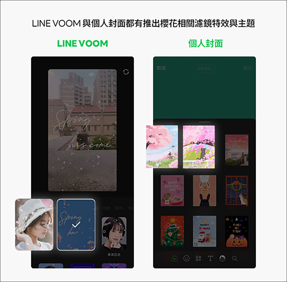 除了 LINE 將有櫻花雨的聊天室特效,用戶還可以在個人封面套用專屬的英光相關主提,讓字幾的 LINE 主頁增添更多春天氣息。此外, LINE VOOM 也同步推出應景的櫻花濾鏡特效,櫻花特效將有「櫻花飄散」和「春日爛漫」兩款選擇,讓自己在櫻花季期間也能拍攝宛如身在櫻花景點現場的美境當中!