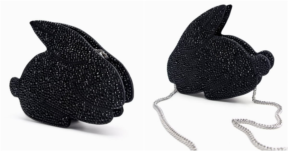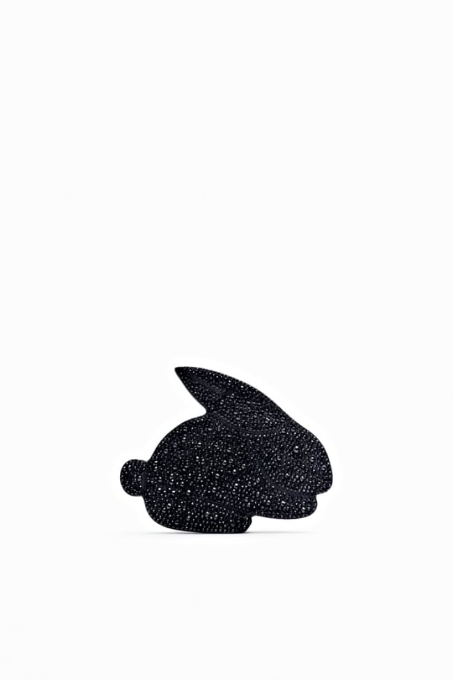 此篇最低調的兔子,就是這隻了(笑)!ZARA推出的一款「鑲上滿滿水鑽」的黑色緞面包包,20+15+3.5CM超級小廢包尺寸,還以為是獨特的幾何圖形造型,仔細一看發現就是一隻兔子的側面,搭配銀色鏈條背帶超有個性。