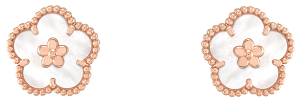 玫瑰金鑲嵌白色珍珠母貝梅花造型耳環,NT$142,000。