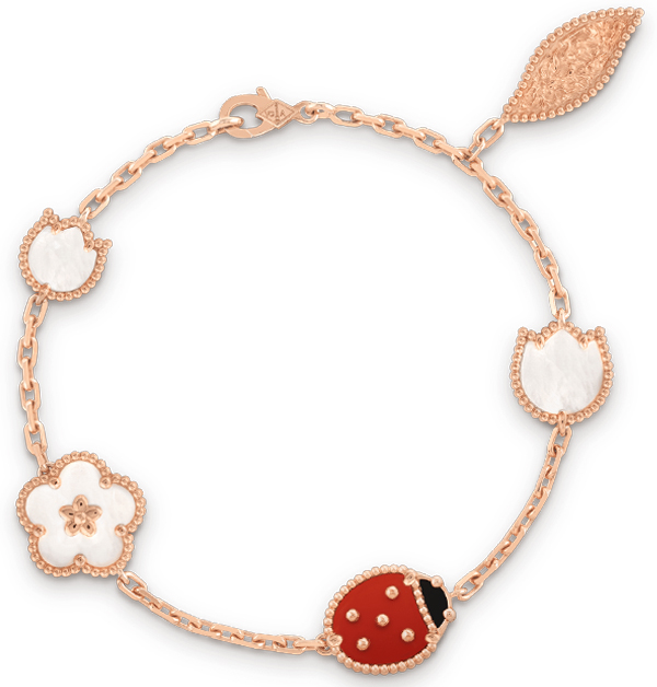 玫瑰金鑲嵌紅玉髓、縞瑪瑙、白色珍珠母貝瓢蟲及梅花造型手鍊,NT$ 164,000。