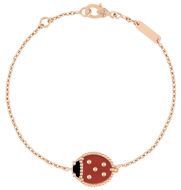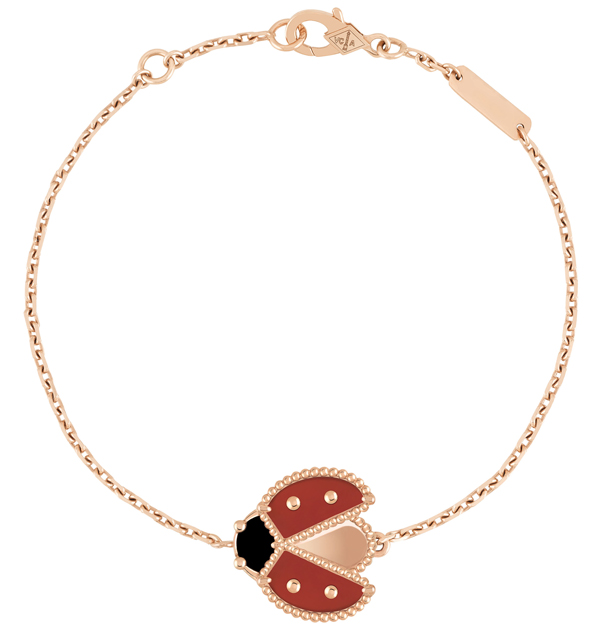 玫瑰金鑲嵌紅玉髓及縞瑪瑙瓢蟲造型手鍊,NT$ 86,000。