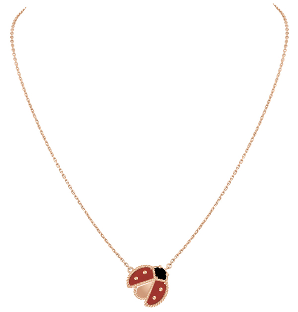 玫瑰金鑲嵌紅玉髓及縞瑪瑙張翅瓢蟲造型項鍊,NT$ 124,000。