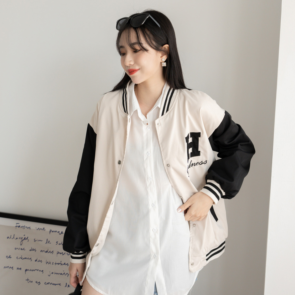 DesireShop黑白拼接棒球外套讓你穿搭隨心所欲,日常約會或是上課的場合穿都好適合。以往棒球外套款式比較偏厚磅路線,這一件棒球外套材質厚薄適中,是春夏款喔!此款有出杏色、黑色,兩色都非常好搭,你有選色障礙嗎?平時穿搭走淺色系,會推薦較甜美系的女生帶杏色,酷帥風格女孩可入手黑色款呦!