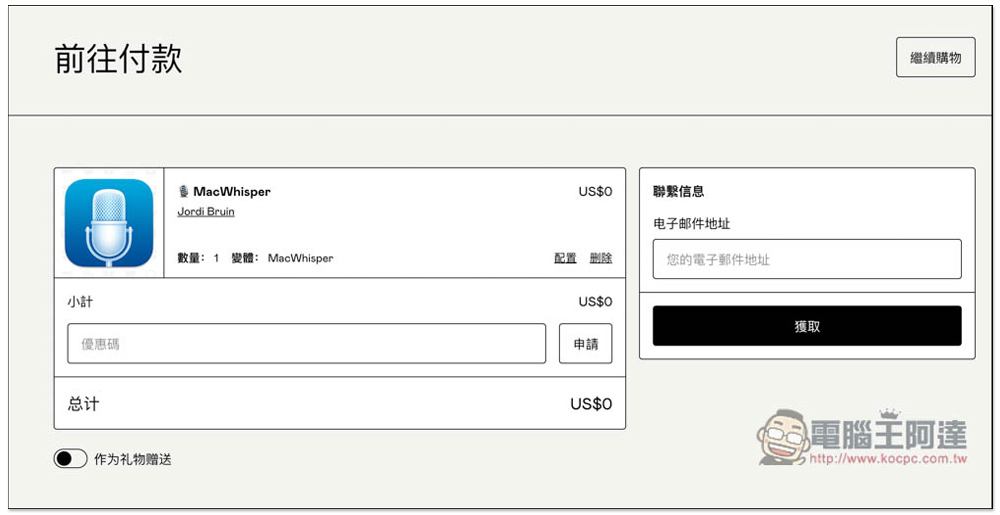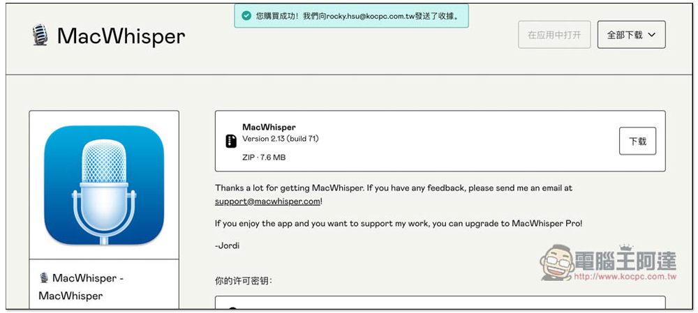 MacWhisper 是一款由 Jordi Bruin 開發的免費工具,沒在 App Store 上架,需要到開發者頁面中取得。進到軟體介紹頁面後,點擊右側的 MacWhisper,也就是 0 元那一個,Pro 付費版可使用完整功能,包括速度更快的模型和 YouTube: